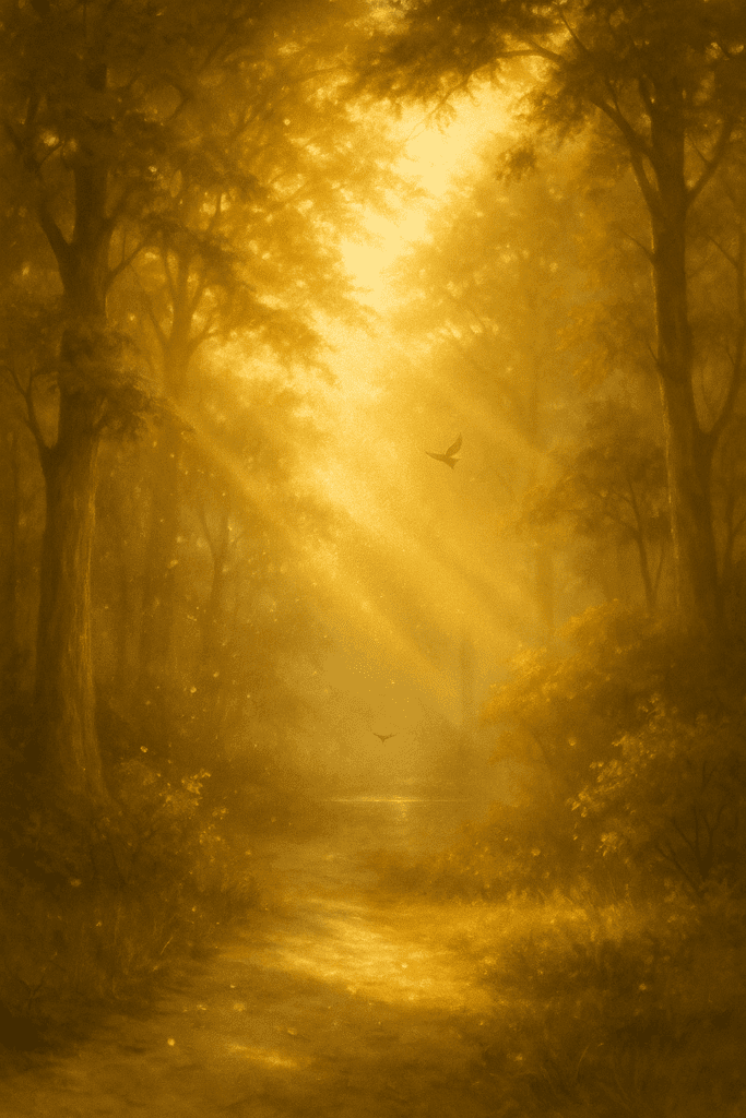 A warm golden beam filters through forest trees, illuminating drifting dust; a small bird glides across the light as if carrying a message.